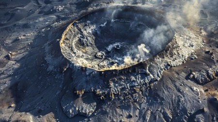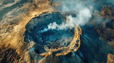 Aerial top view of a volcanic caldera with a steaming fumarole and surrounding rugged landscape