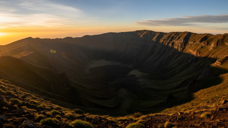 A stunning panoramic view of a massive volcanic caldera crater bathed in the golden light of sunrise. The rugged, grassy slopes of the rim contrast with the shadowed floor, creating a dramatic and majestic geological landscape.