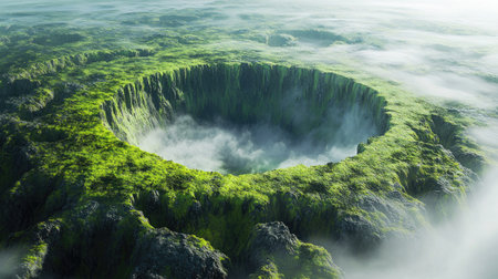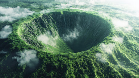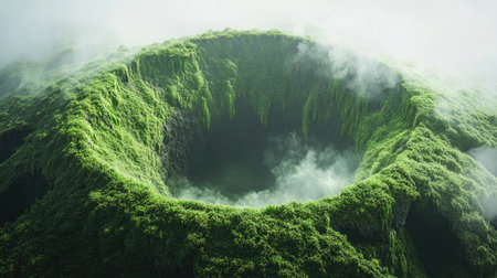 Breathtaking aerial view of a circular sinkhole surrounded by lush greenery and mist. This serene landscape showcases nature's beauty and geological wonders.