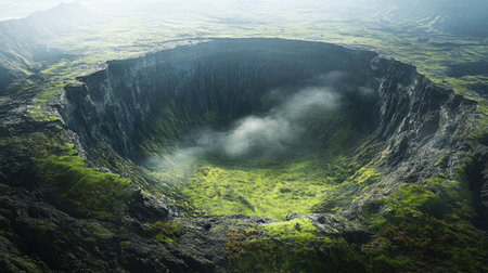 A captivating view of a lush green crater enveloped in mist and fog showcases the beauty of nature's volcanic origins. The serene landscape invites exploration.