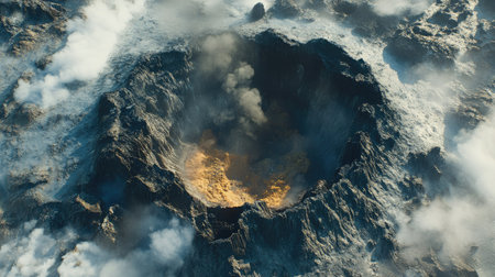 A top view shot of a steaming volcanic vent with sulfur deposits and barren rocky landscape around