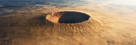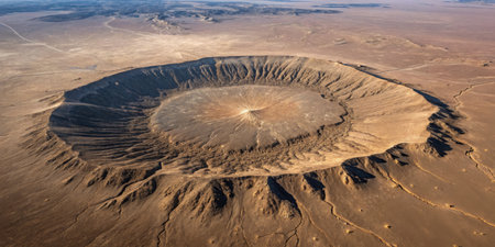 Aerial view of a massive impact crater formed by a meteorite collision on a desolate, sandy planet, highlighting the destructive power of cosmic events and the vastness of space