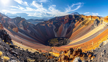 Panoramic view of a deep volcanic crater with colorful striated walls and surrounding mountains under a bright blue sky.