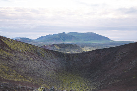 Volcanic landscapes of the Snaefellsnes Peninsula in Iceland, with vast craters, rugged terrain, and distant green mountains under a cloudy sky.