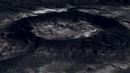 Volcanic crater with lake and active volcano. 3d render