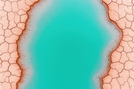 Dry cracked ground with blue turquoise water as abstract background. AI Gen.