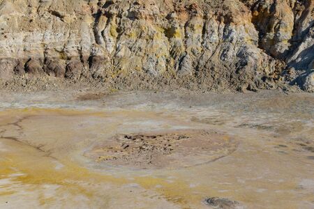 close up view down to small boiling mud volcanoe pond with colorful textures and pattern around