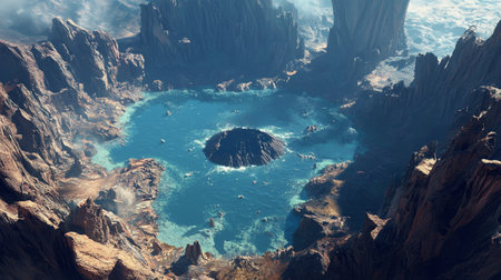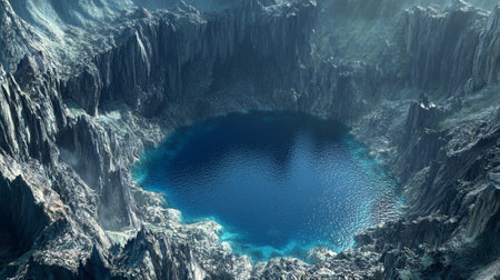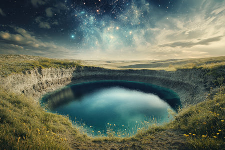 A surreal landscape with a crater lake reflecting the sky. The image showcases the beauty and wonder of nature, with a sense of mystery and otherworldliness.