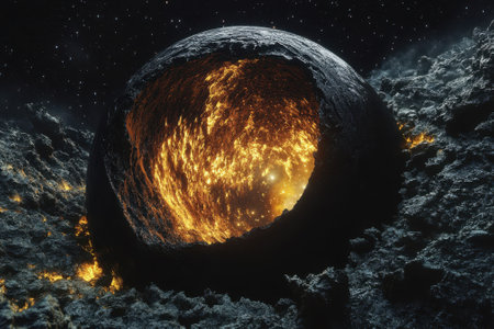 The image captures a glowing molten core within a rocky planet, set against a starry cosmic background.