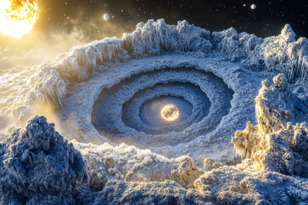 An extraordinary frozen vortex emerges from an alien landscape, surrounded by distant planets and a glowing sun.