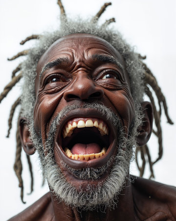 Elderly man with dreadlocks and gray beard, shouting with wide open mouth, showing teeth, with a strong facial expression and intense emotion.