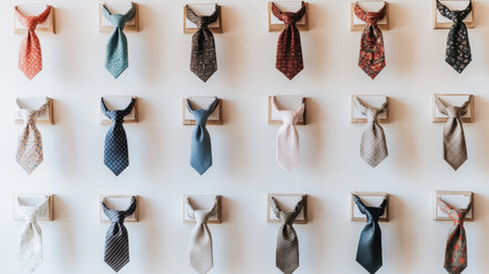 A visual arrangement of colorful ties displayed on a wall, showcasing various patterns and textures, ideal for fashion and accessory inspiration.