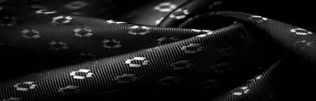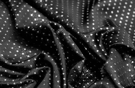 Silk fabric. Black and white squares with floral print. The flowers are black and white. Texture background pattern. From the floral print, the fabric breathes in spring and good mood.
