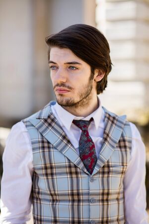The handsome caucasian young man in a white shirt and suit standing, black background