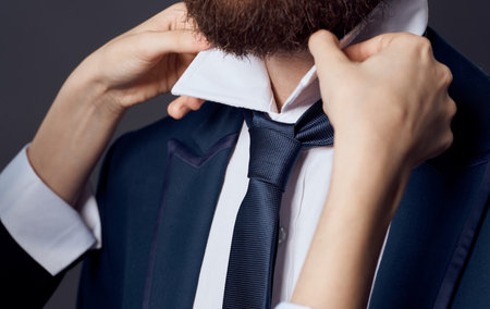 Studio portrait of a young bearded handsome guy of twenty-five years old, in an official suit, tightens his tie. On a dark background. Dramatic light. Official style. Office Style. Fashion and office