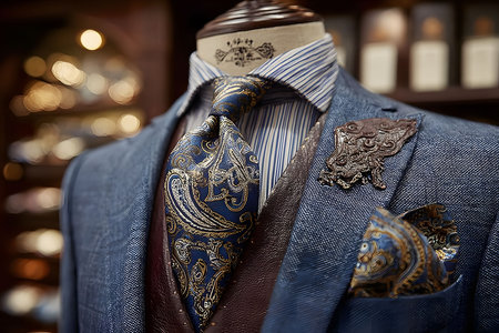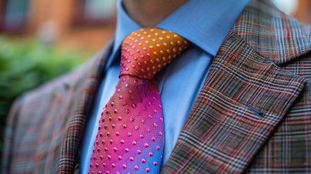 A well-dressed man stands confidently, showcasing a tailored suit complemented by a distinctive tie featuring intricate patterns. The ambiance reflects a refined atmosphere, highlighting his elegance in detail.
