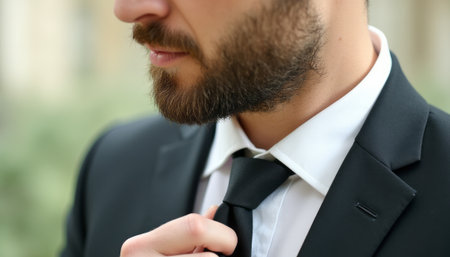 A sophisticated man in a stylish suit adjusts his vintage tie pin, exuding elegance and charm in a refined indoor setting. Perfect for fashion themes.
