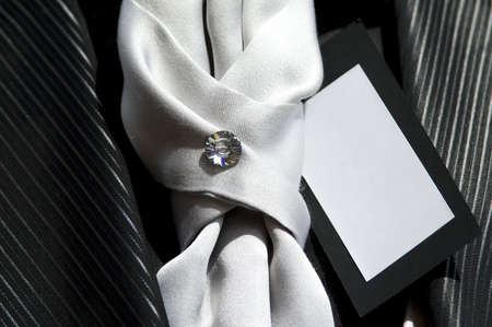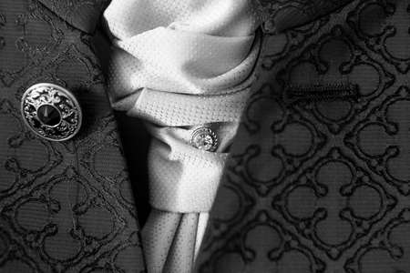 Close up stylish black groom suit with white stylish tie and diamond in middle