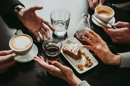 Group of unrecognizable people busy on mobile while having snacks together at restaurant - Concept of millennials having junk food, phone addiction, social media sharing and connection