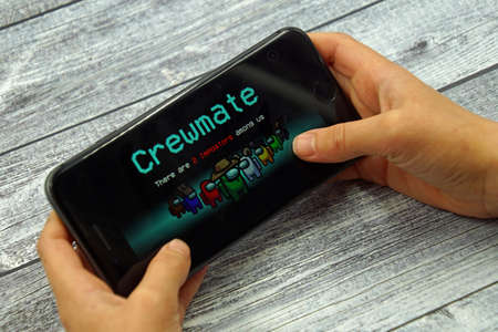 Amsterdam, the Netherlands - November 13, 2020: Child playing Among Us and receives the role of crewmate.