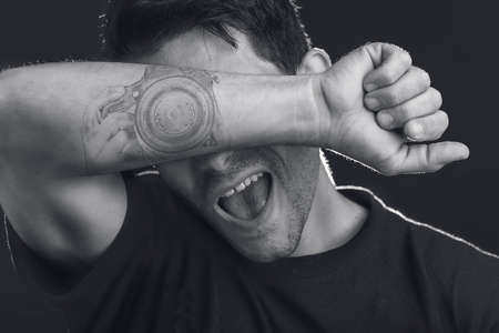 Portrait of young man screaming. Looking up in anger and making angry hand gestures.