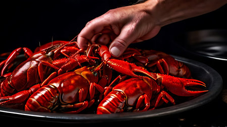Passing around a bucket of fresh seafood, lobsters, crabs or shrimp, cracking legs and tails while telling laughing stories. Generative AI