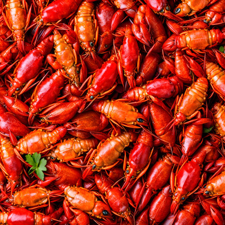 Delicious red boiled crayfish as background, top view