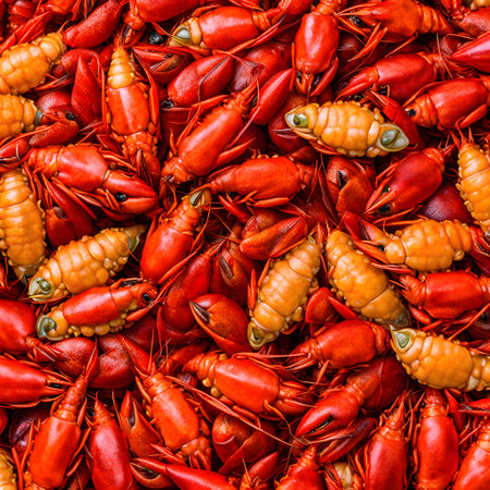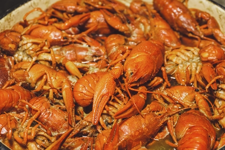 A lot of hot and spicy boiled crawfish ready to be eaten