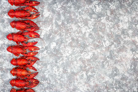 Gray white concrete background with a border made from crayfishes, copy space, horizontal, top view