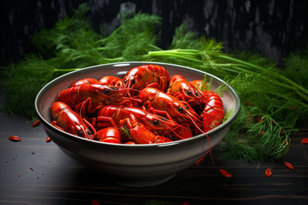 Boiled crayfishes in a bowl with dill on a wooden table