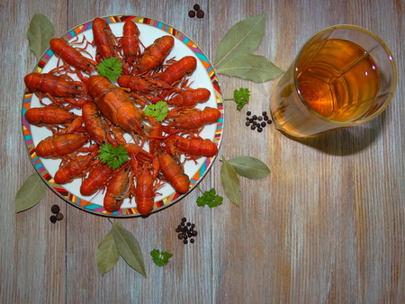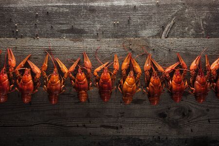 Crawfish cooked and served on wooden background