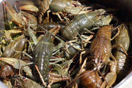 Closeup fresh Astacus or River cancer. Photo from above in a bucket