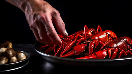 A close-up image of a hand reaching for cooked crawfish in a bowl, surrounded by garlic cloves and spices on a dark background, highlighting a traditional seafood meal.