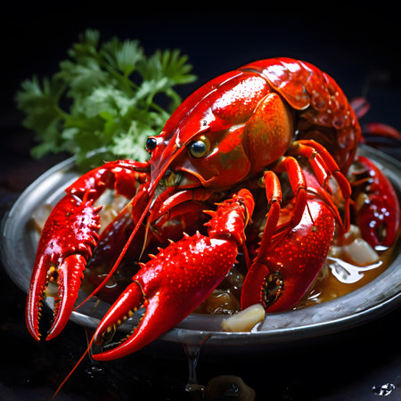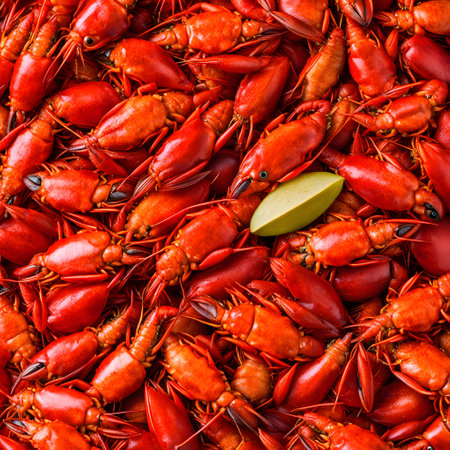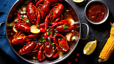 A mouth-watering crawfish boil featuring vibrant red crawfish, fresh lemons, corn on the cob, and an assortment of spices arranged on a dark background, perfect for a festive meal.
