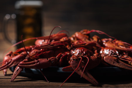 Boiled red crawfish on the wooden surface against a mug of beer background. Closeup, selective focus, toned,