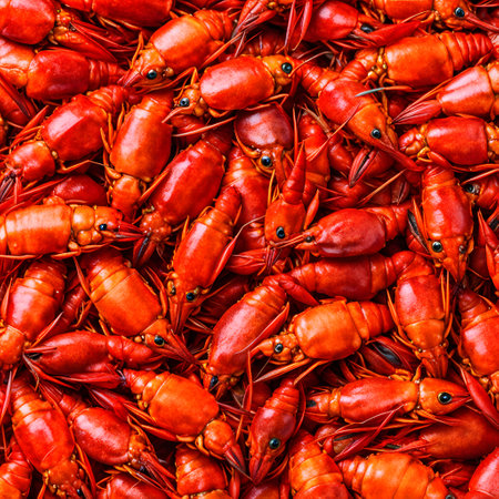 A vibrant display of reddish brown crustaceans seasoned and prepared for enjoyment at a bustling seafood festival.