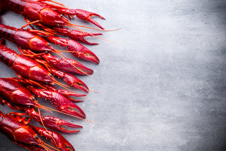 Cooked red crayfishes on black stone background. Red boiled crayfishes food. Shellfishes delicious lunch.