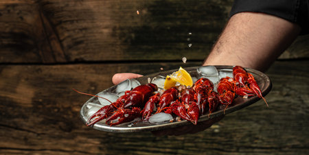 Crayfish or baby Lobster. Red boiled crawfishes on a wooden