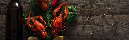 panoramic shot of red lobsters, lemon slices, dill and glass bottle with beer on wooden surface