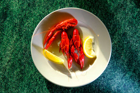 Close up delicious boiled crayfish food on a plate. Healthy and dieting meal