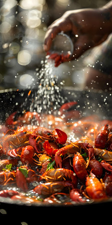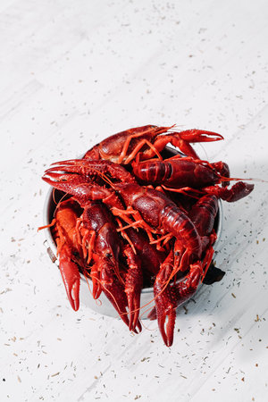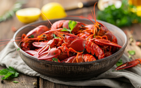 A hearty bowl filled with spicy boiled crawfish, seasoned with herbs and spices, perfect for a stock photo highlighting Southern cuisine