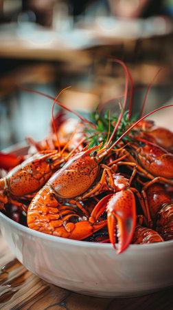 An exquisite display of crawfish in a pristine white ceramic bowl, set against a blurred background for an artistic culinary presentation