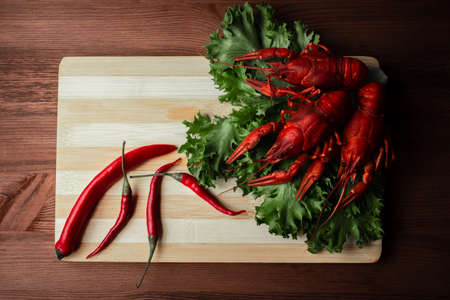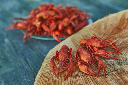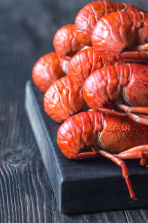 Boiled crayfish on the wooden board