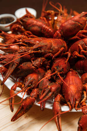 Boiled red crayfish on a plate.