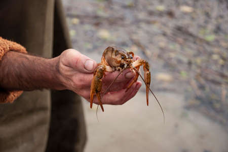 large crayfish caught in the river close background