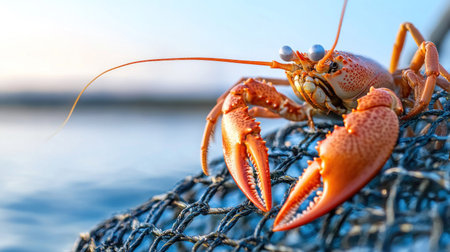 Orange crab with large claws on fishing net