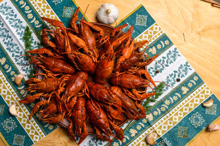 Crayfish boiled with spices on the kitchen table. View from above.