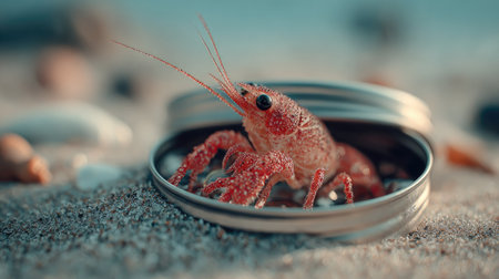 A close-up captures a bright red crawfish nestled within a silver container. The crawfish displays intricate textures and details. The scene unfolds on a sandy surface, suggesting an outdoor setting with natural lighting. This image could be used for various commercial or editorial purposes related to nature or seafood.