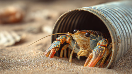 A crustacean is partially visible, emerging from a cylindrical metal structure resting on a sandy surface. The image showcases the animal's detailed features, with focus on its claws and eyes. Warm lighting enhances the earthy tones. Suitable for illustrative or educational applications, and versatile for a variety of visual content.