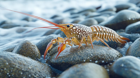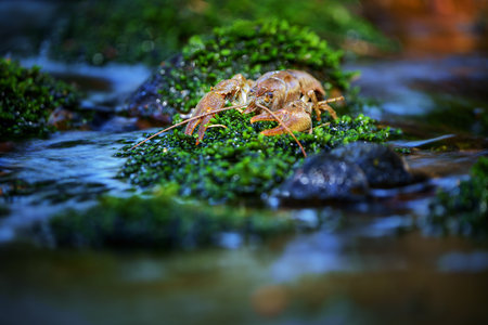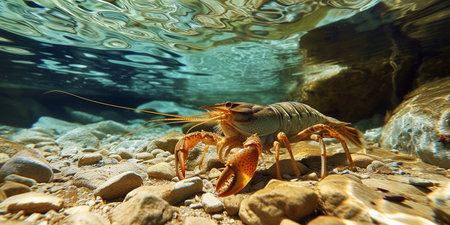 Stone crayfish crawling among river rocks in clear freshwater habitat. Native to Europe, this species prefers clean, well-oxygenated streams and rivers.